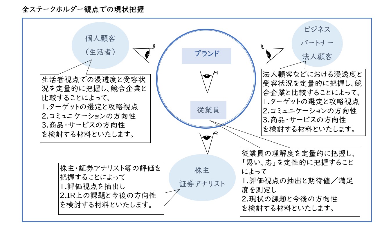 全ステークホルダー観点での現状を把握し、コーポレートブランドのブランド戦略を立案する材料とすることが重要です。ブランディングは、事業戦略、マーケティング戦略そのものであり、コミュニケーション戦略だけで構成されるものではありません。