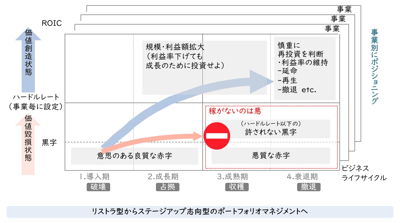 しかし、今後の事業マネジメントとしては、グループ全体としての持続的成長と中長期的企業価値向上のために、各事業を成長の理想曲線に乗せるステージアップ志向のポートフォリオマネジメントへ変革することが求められます。