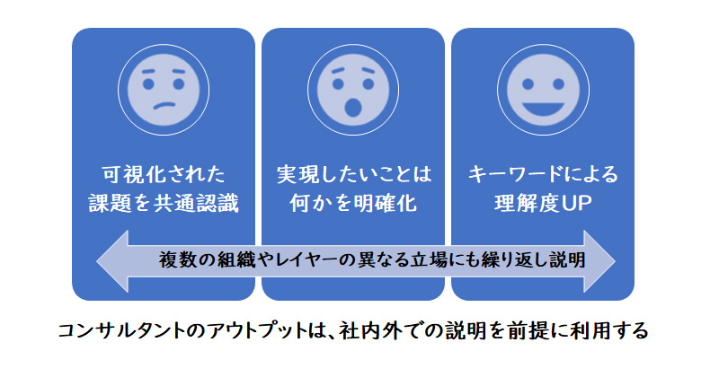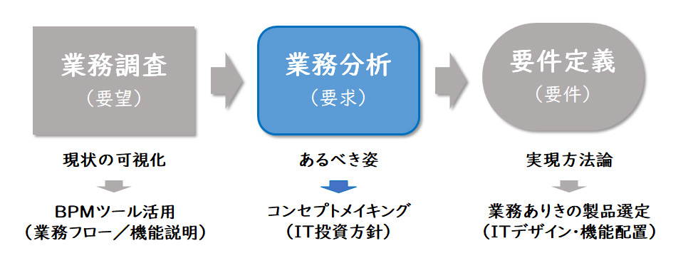 前工程で現状業務調査を行ったことから、具体的な課題整理といった業務分析からあるべき姿を導き出す取り組みとなります。ヒアリングや現場視察などを通じて可視化されたクライアント業務の内容から、課題を体系化のうえで整理することだけでなく、本来あるべき姿やクライアントの要望、他業界でのトレンドなども加えて、課題に対する解決方針だけでなく、将来の成長に向けた変革ポイントにも積極的に意見を加えていきます。