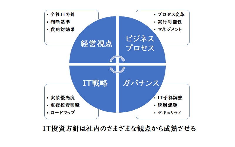 そのため当クライアントでは、この後にも異なるビジネス領域のリプレースに取り組む必要もありました。またクライアントとしては、会社として進むべき方向性(IT投資方針)について、中長期的にまとめるとともに、社内や社外の関係者に説明することが求められていました。