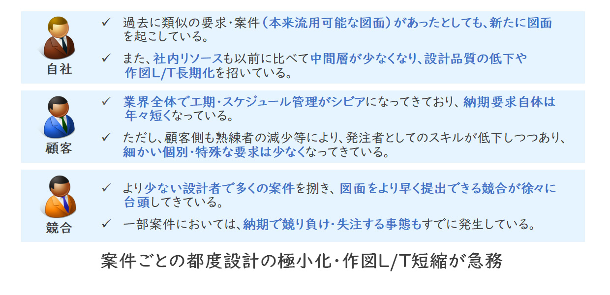 当クライアントでは、古くから顧客の千差万別な要求に応える柔軟なカスタマイズ技術を強みとし、業界内で高いポジションを維持してきましたが、近年顧客側の知見者(“仕様のプロ”)が減少するとともに、個別・特殊要求が減り、本来の強みが失われつつありました。さらには、柔軟なカスタマイズの代わりに短納期の要求が強まり、競合はそれに対応しつつある中、御用聞き営業・個別受注設計から脱却できず、その設計L/Tの長さから失注も生じていました。