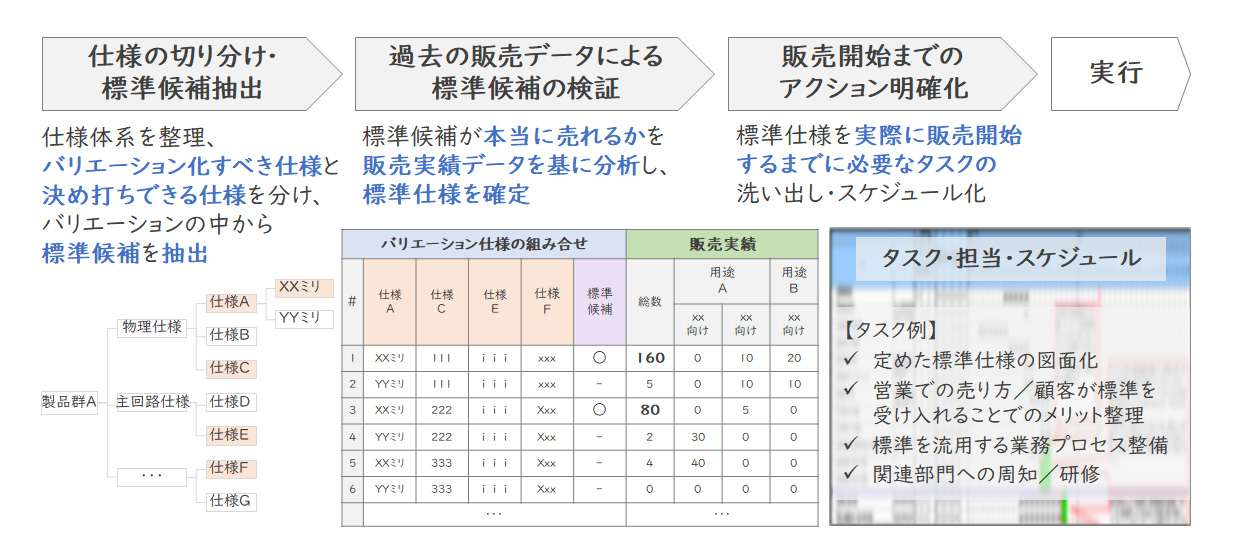 そこで方針を切り替え、製品1台としての標準を複数種類定め、これを販売メニュー化する方針としました。また、これまでの販売実績データを基に、どの仕様がどのぐらい売れたのかを分析し、案件の8割をカバーできる仕様を標準と定めました。さらに、データ分析の際にはモジュラー化ではなく、製品1台分の標準仕様を定めることとなるため、個々の仕様ごとではなく、組み合わせで実績を見る必要がありました。全ての仕様を対象とすると組み合わせが膨大となるうえ、細かい仕様については実績データが存在しないという事態も発生するため、仕様を顧客の要望によってバリエーション化できる仕様と、当クライアントとして標準を決め打ちできる(個別要望があっても当社標準に誘導できる)細かい仕様に切り分け、前者を対象とすることで分析を可能にしました。