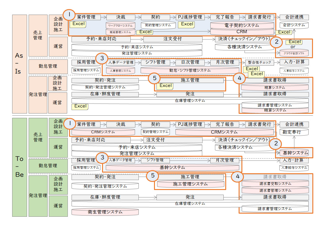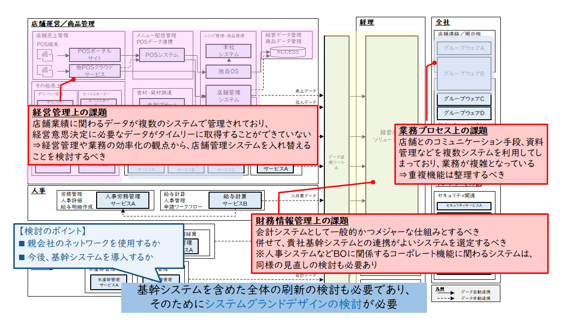 そういった中、まずは、各事業で使っているシステム・ツールに注力し、調査するところから始めました。大きく分けて、①目的・用途が重複しているシステム・ツールが重複しているところを発見するとともに、②システム全体のアーキテクテャーにおよぶ課題を抽出し、オペレーションを行っているメンバーの感情に配慮する進め方を採用しました。