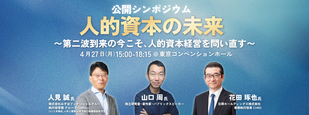 本シンポジウムでは、人的資本を未来軸で捉えなおすことをテーマとし、CHRO・有識者を交え、それぞれのお立場やご経験に基づく意見を披露いただき、ご参加の皆様ともインタラクティブに意見交換を行う時間を予定しています。「わが社らしい人的資本経営」を再考する機会として、ご参加・ご活用いただければ幸いです。