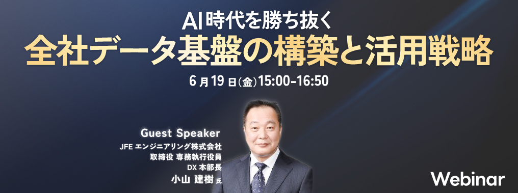 長年DX改革を推進し、データ戦略の策定・実行を主導されてきたJFEエンジニアリング株式会社 取締役 専務執行役員 DX本部長 小山 建樹氏より、 AI時代におけるデータ基盤の構築・進化やデータ活用方法の具体的な実例とともに、それをどのように実業務へ展開したのかについてお話しいただきます。