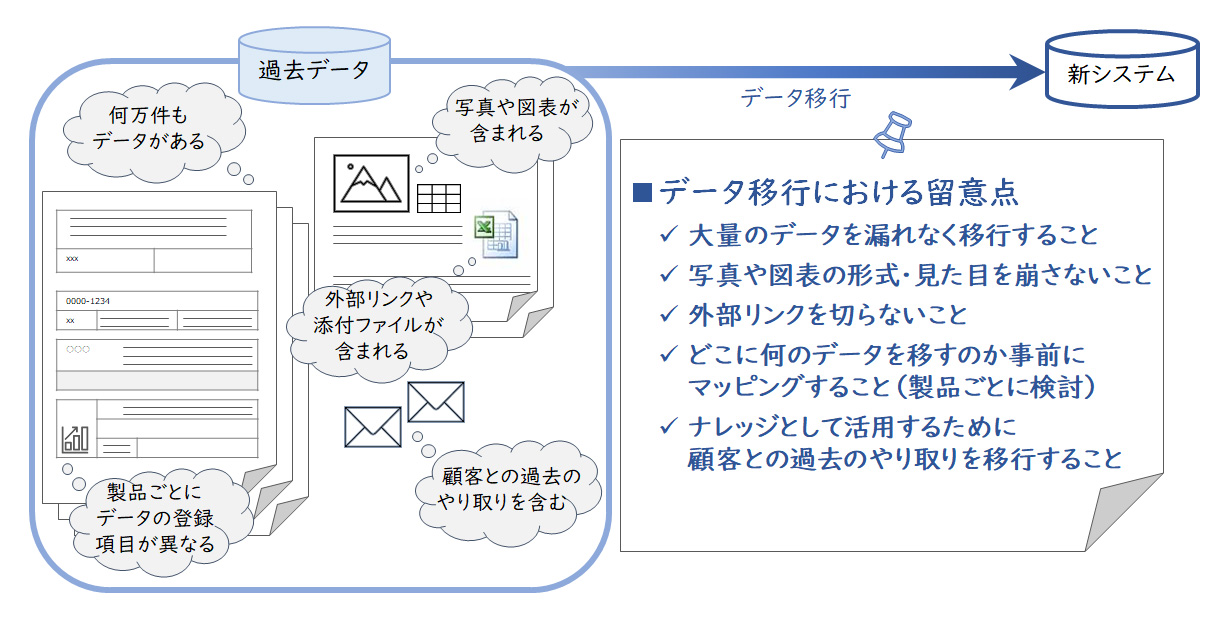 ただし、過去データの移行が重要である一方、過去データを“正しく”移行することは難易度が高く、慎重に取り組む必要があります。過去データは、システム導入以前の紙・個人のExcel・メールで管理しているケースも多く、そういった情報を正しく新システムに移行し、いつでも・誰でも・どこでも使いやすい形にしておく必要があります。移行を成功させるためには、「①移行すべきデータ/する必要がないデータの切り分け」、「②新システムでの活用方法の明確化を事前に整理」しておく必要があります。特に文章データだけではなく、写真データやPDF等のデータも多くあるため、事前の整理が重要です。