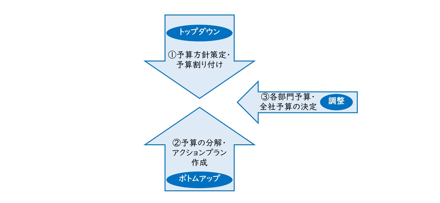 予算は一般的に、マネジメントや経営企画部門等が設定し、現場部門に伝えるトップダウン方式と、現場が予算の原案を決定し、経営企画部門等でまとめ上げるボトムアップ方式があります。トップダウン方式は迅速な予算策定が叶う一方、予算がノルマのようになったり、現実味のない数値になりがちですし、ボトムアップ方式だと現実的な数値になりますが、達成しやすいハードルの低い数値になりがちというそれぞれのメリット、デメリットがあります。