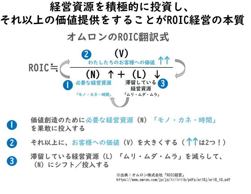【図5】はオムロン社が公表しているROIC翻訳式です。オムロン社はROICを「積極的にモノ・カネ・時間を投資し、その投資以上の価値をお客様へ提供すると同時に、経営資源のムリ・ムダ・ムラを減らすこと」と解釈しています。「経営資源のムリ・ムダ・ムラを減らす」とは、具体的には利益に貢献していない(ムダになっている)経営資源や、古い設備(ムリに使用することで品質のムラをもたらす)を削減することを意味しています。このような翻訳式によって、財務諸表とは関わりの薄い営業や開発部門担当者が、ROICを向上させる取り組みを具体的にイメージできるようになります。