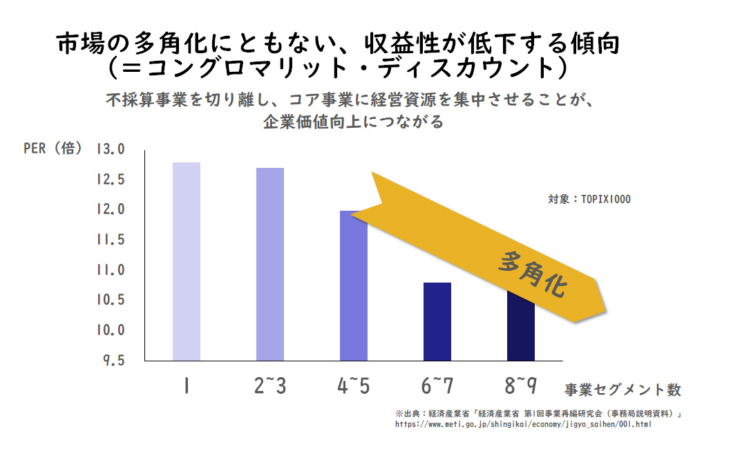 「コングロマリット・ディスカウント」とは、複数の事業を抱えることで、企業全体の評価が一部の事業によって引き下げられる現象です。【図1】はまさに事業セグメント数が増えることで、収益性を示すPERが低下していることを示しています。これは、不採算事業を切り離し、コア事業へ経営資源を集中させていくことの重要性を物語っています。