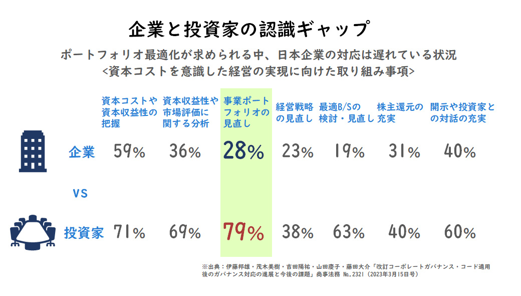 残念ながら「事業ポートフォリオの見直し」は、企業と投資家の間で重要性の認識に大きな乖離があります。企業は経営資源の選択と集中のために、「事業ポートフォリオの見直し」をさらに推進していく必要があります。
