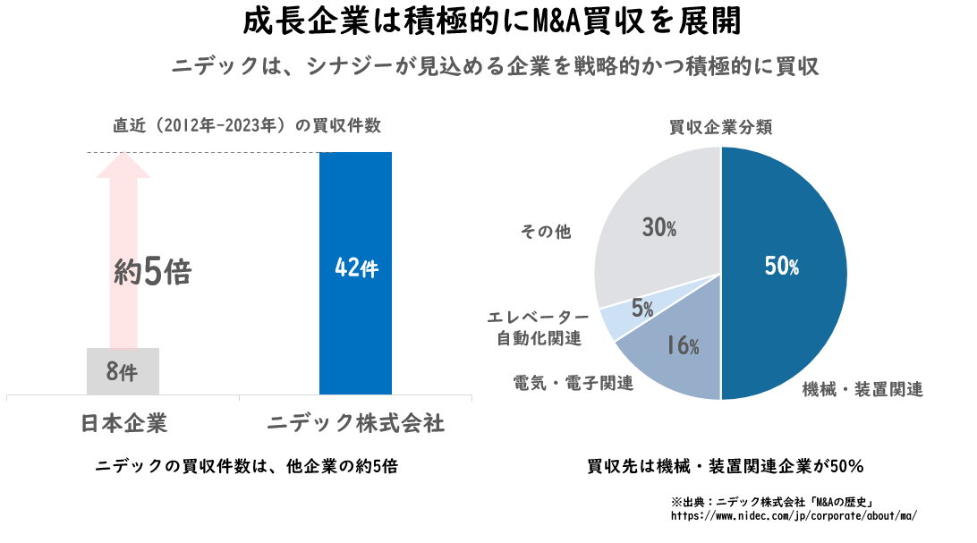 M&Aが特に積極的な企業として知られている企業はニデックです。シナジー効果が期待できる企業をターゲットに買収を重ねており、その買収件数は平均的な日本企業の約5倍に上ります。ニデックは工作機械業界のM&Aに注力しており、TAKISAWAの買収が話題になりました。かつて買収に失敗したものの経産省のガイドラインを活用し、ついに買収を成功させ、現在でも2倍以上の高いPBRを維持しています。