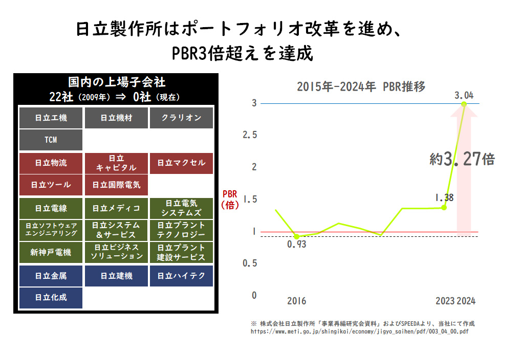 事業売却で成功した企業として知られている企業は日立製作所です。日立グループは、再編により国内上場子会社はゼロとなり、長年日立グループの業績に貢献してきた企業も次々と売却しました。中には「御三家」と称された日立化成や日立金属も含まれます。この売却は一般的な「不採算だから」ではなく、積極的な「攻めの事業売却」といえます。日立は成長ストーリーを見据えた売却に踏み切り、競争力を維持したまま交渉を行い、成長資金を獲得し、PBR3倍超えを達成しました。