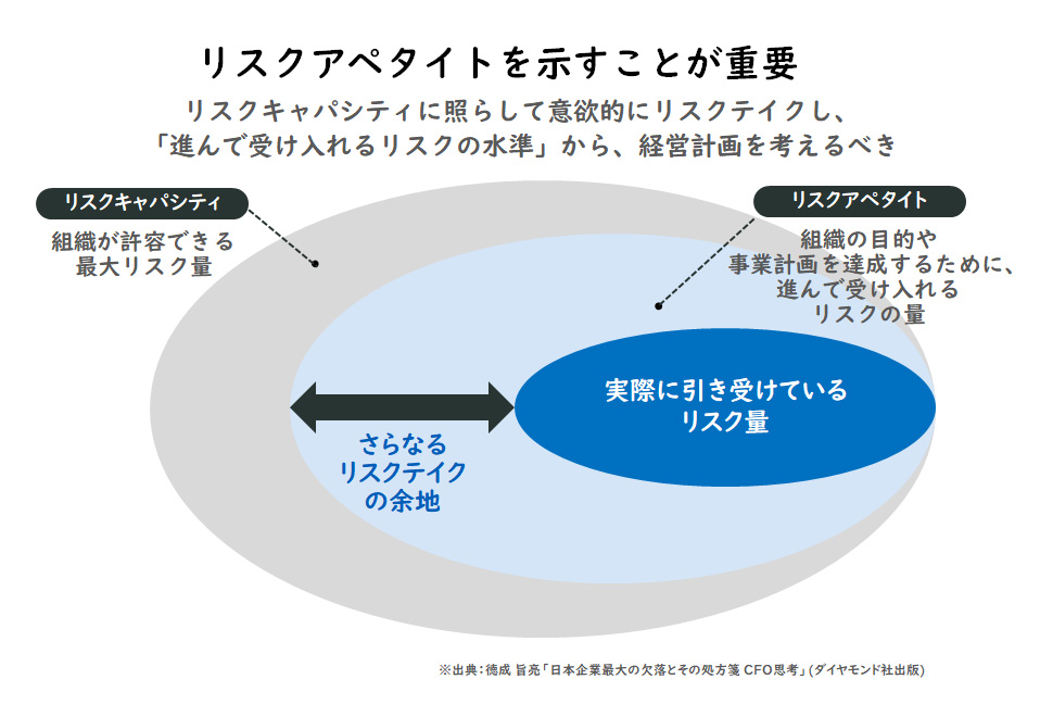 解決策としては、リスクアペタイトの考え方を利用することです。株主の視点から見れば、リスクアペタイト(企業が受け入れるリスクの水準)は、最大限であることが望ましいとされています。言い換えれば、経営計画を策定する際には、このリスクアペタイトがリスクキャパシティ(企業が許容できる最大リスク量)に限りなく近づいている必要があります。理想的なコーポレートガバナンスは、CFOを中心にこのリスクテイクの余地をしっかり把握し、企業が持つアニマルスピリッツを活性化させている状態であるといえます。