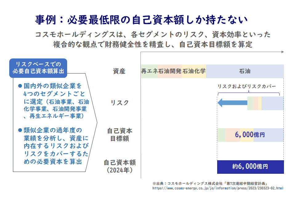 これまでの常識では、自己資本比率の増加はよいとされていましたが、現在は過剰な資本を持たず、効果的な成長投資を行うことが重視されています。コスモホールディングスは、類似企業のベンチマーク調査を通じ、リスクアペタイトとしてリスクを加味した必要最低限の自己資本額を把握し、目標額の設定と公表を行っています。