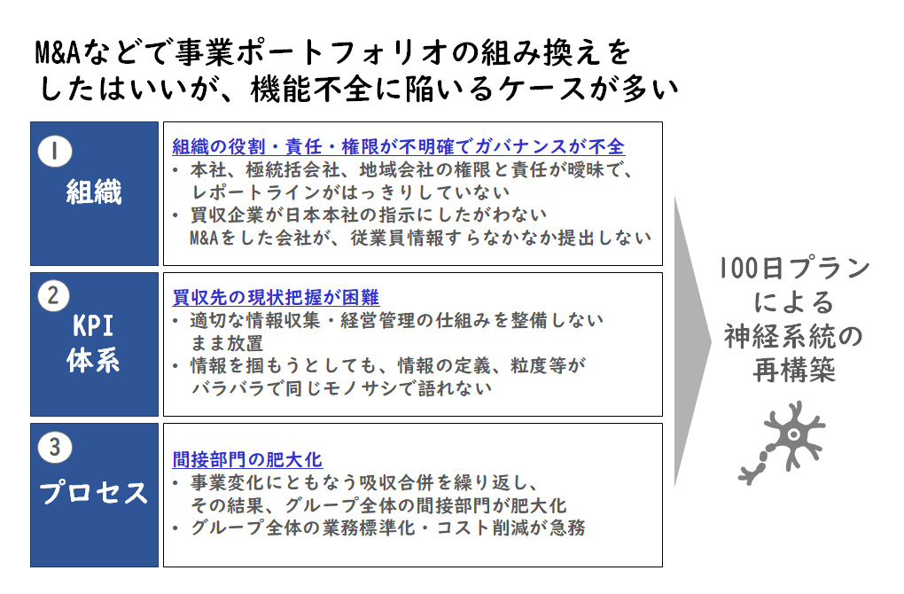 M&Aを含む事業ポートフォリオの改革後には、業績が予定水準を下回る場合や、文化の不一致から組織の統合に失敗する場合があります。一般的には、「組織の問題」、「KPI体系の不備」、「プロセス」の領域において問題が発生することが多いです。このような課題に対処するには、100日プランを用いて迅速に神経系統を構築することが求められます。