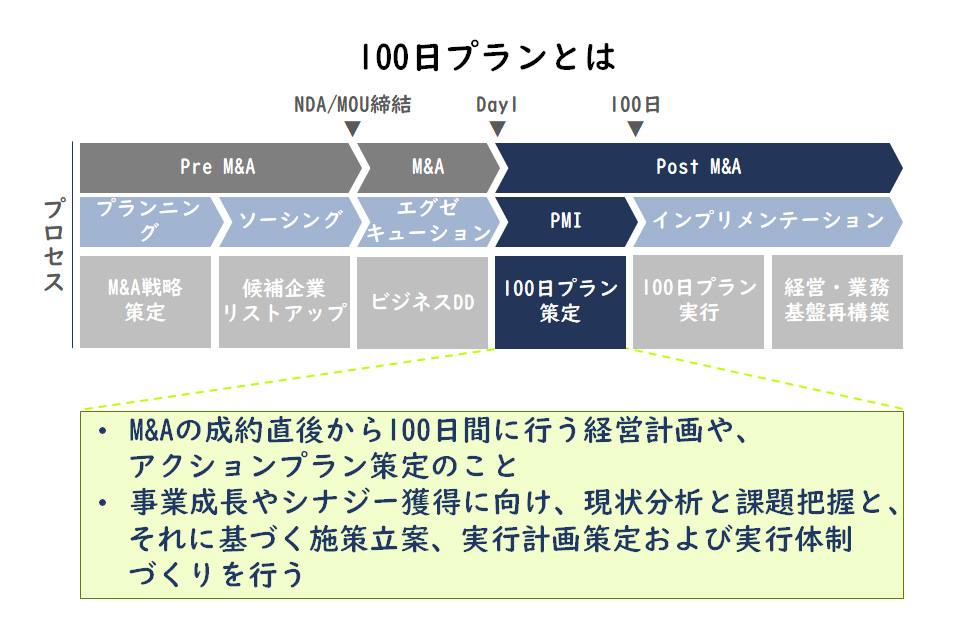 100日プランとは、買収後の最初の100日間に実行する具体的なアクションプランを指します。