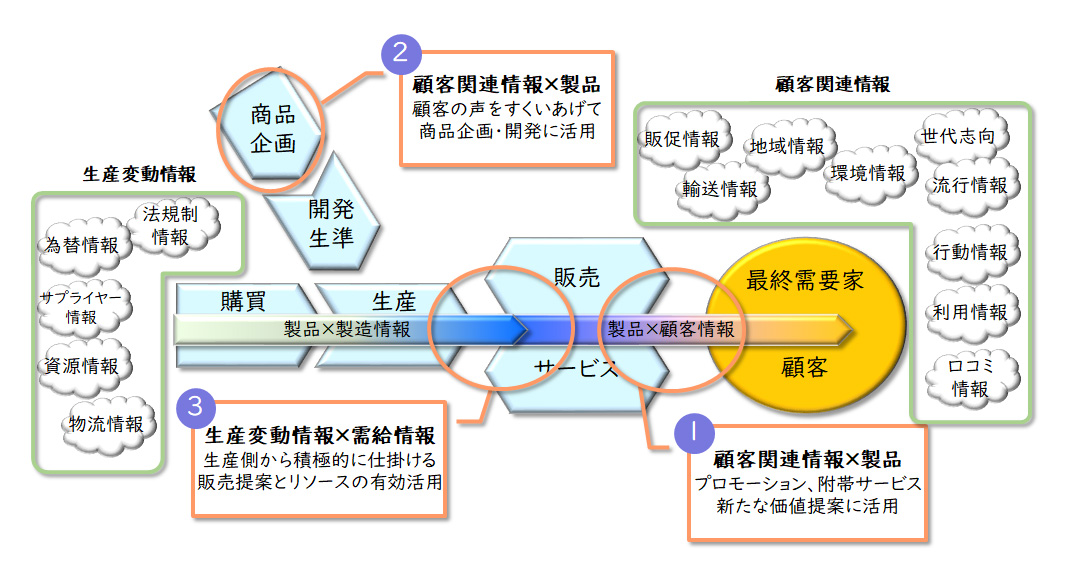 そこで今回は、そのデータの代表例として、顧客関連情報と製品といったデータをつなげることで見えてくるビジネス変革ポイントを3点紹介します。