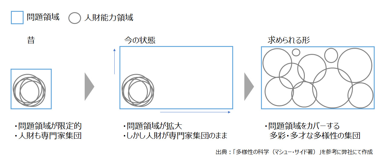 問題領域が拡大し、単一の専門家集団では対応できないため、多才で多彩な人財が求められるようになりました。例えばエンジン自動車メーカーであったが、SDGs、ESGとして環境問題の視点から電気自動車が求められ、問題領域が拡大し、多様な人財、多才な人財が求められるようになりました。