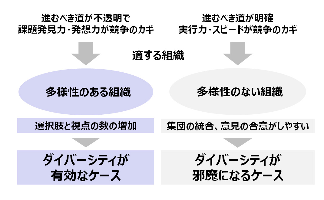 ダイバーシティはあくまで手段であり、目的ではありません。海外展開やイノベーションなど、ダイバーシティの実現後に取り組みたい施策を検討せずに、バズワード対応としてダイバーシティを推進し、経営戦略との関連性が見いだせず失敗する例もあります。実は専門家集団のほうがパフォーマンスを出す部署で、多様性が必要のない部署にもかかわらず、ダイバーシティということで「異能」を入れることによって、意見が合意しづらくなり、スピードが低下し、ダイバーシティが邪魔になるケースも発生しているようです。【図4】参照