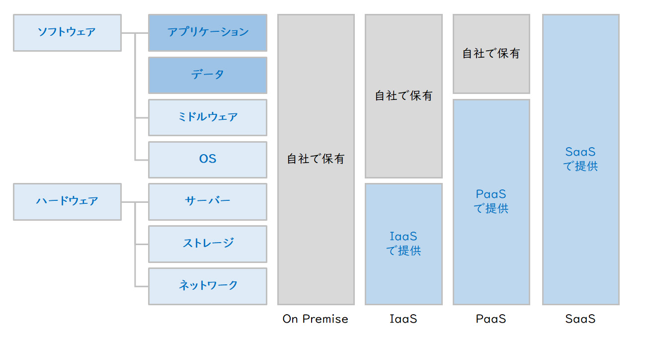 これらのシステム資源を全て自社の施設内(オンプレミス)に設置されたハードウェア上で運用・管理する形態で持つことをオンプレミスといいます。これらのシステム資源をクラウドサービスとして提供を受けることをIaaS(Infrastructure as a Service:システムを構築するためのインフラをクラウド上で提供するサービス)、PaaS(Platform as a Service:アプリケーションのためのプラットフォームをクラウド上で提供するサービス)、SaaS(Software as a Service:特定のアプリケーションやソフトウェアをクラウド上で提供するサービス)といいます。