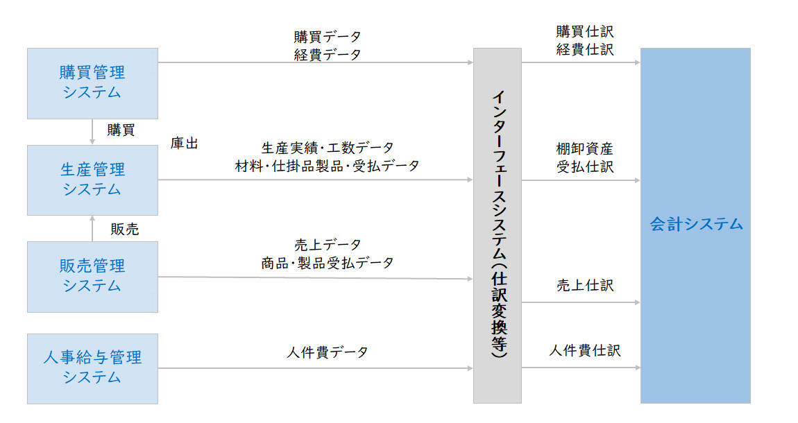 会計システム以外の基幹システムを、会計システムから見て上流システムと呼ぶこともあります。それは、これらのシステムのデータが元になって、会計データが作られることに由来しています。また、これらの上流システムから会計システムへ取引データを送り、それらを仕訳に変換するインターフェースシステムを用意していることも一般的です。特に上流システムが古く、いまだ自社開発のシステムである場合、データの流れ等が複雑化するため、このインターフェースシステムが重要なシステムになります。