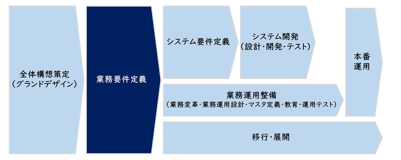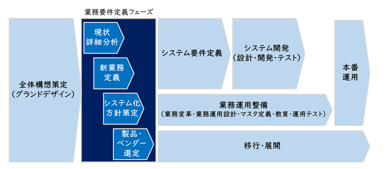業務要件定義フェーズは、今後目指す新しい業務を具体化し、それを実現するためのシステム化方針を明確化するとともに、導入対象となるERPや会計パッケージと導入ベンダーを選定する重要なフェーズです。