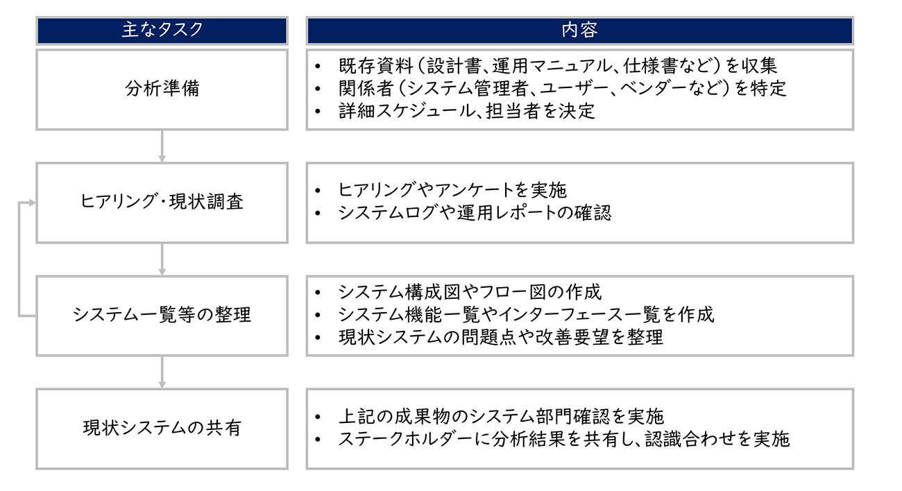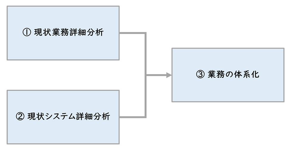 現状詳細分析では、現状の業務とシステムを詳細に分析し課題を整理します。