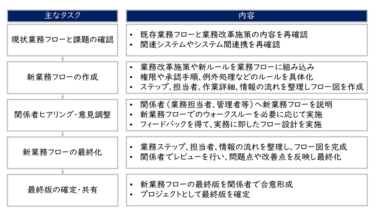 実務担当者や管理者の意見を反映し、現場に即した新業務フローを作成する必要があります。