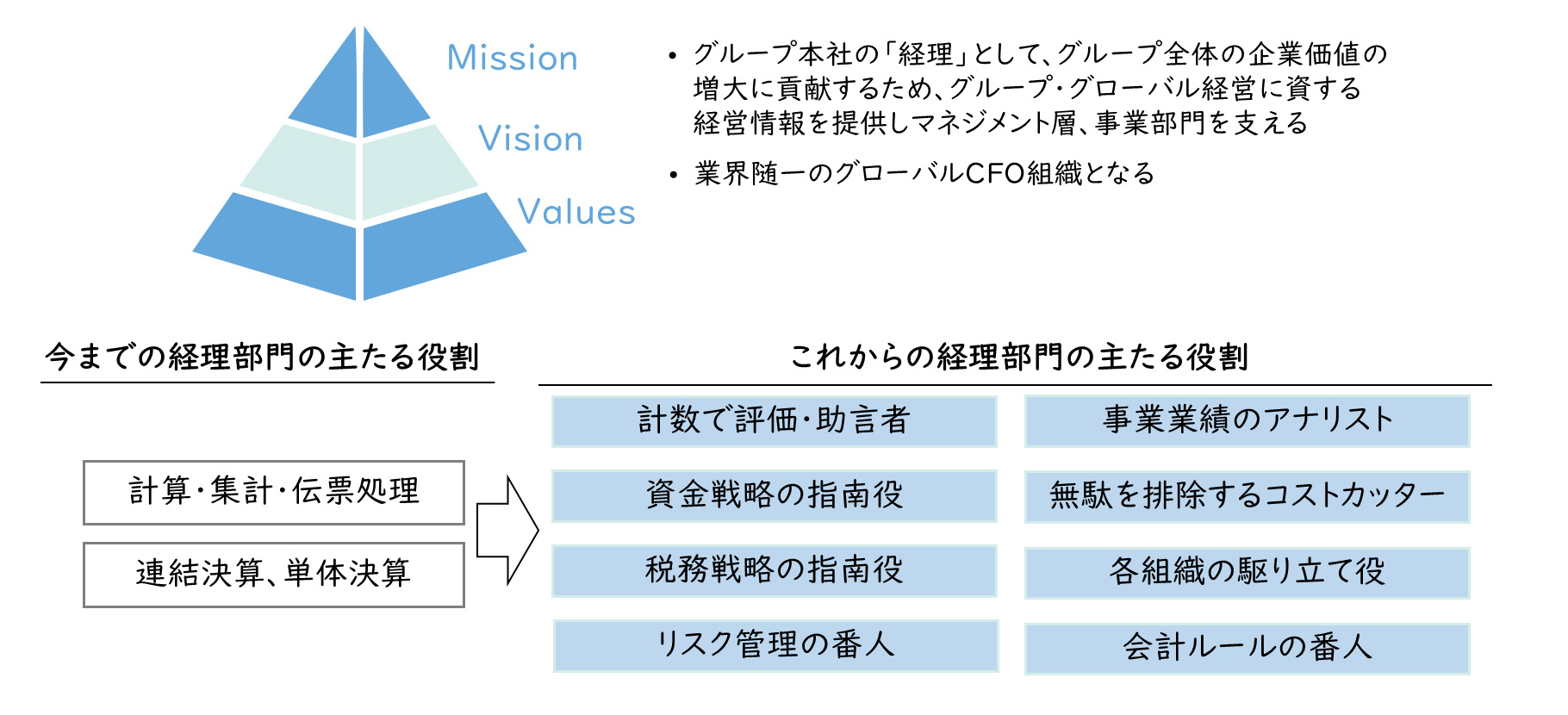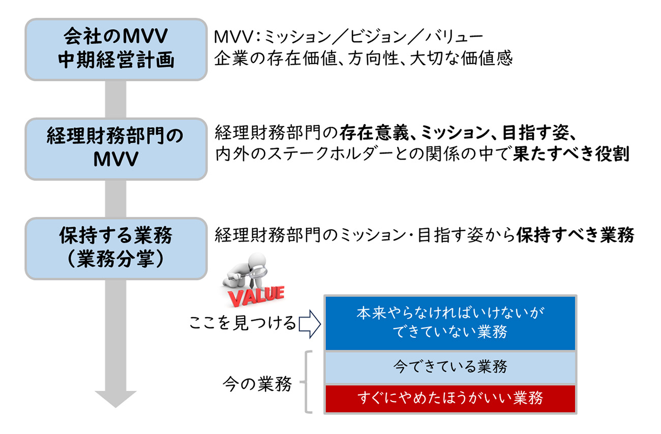 したがって、経理財務部門は、自らの組織の価値を高めるため何をなすべきかを、全体構想の中で、部門をあげて練っていくことが重要です。