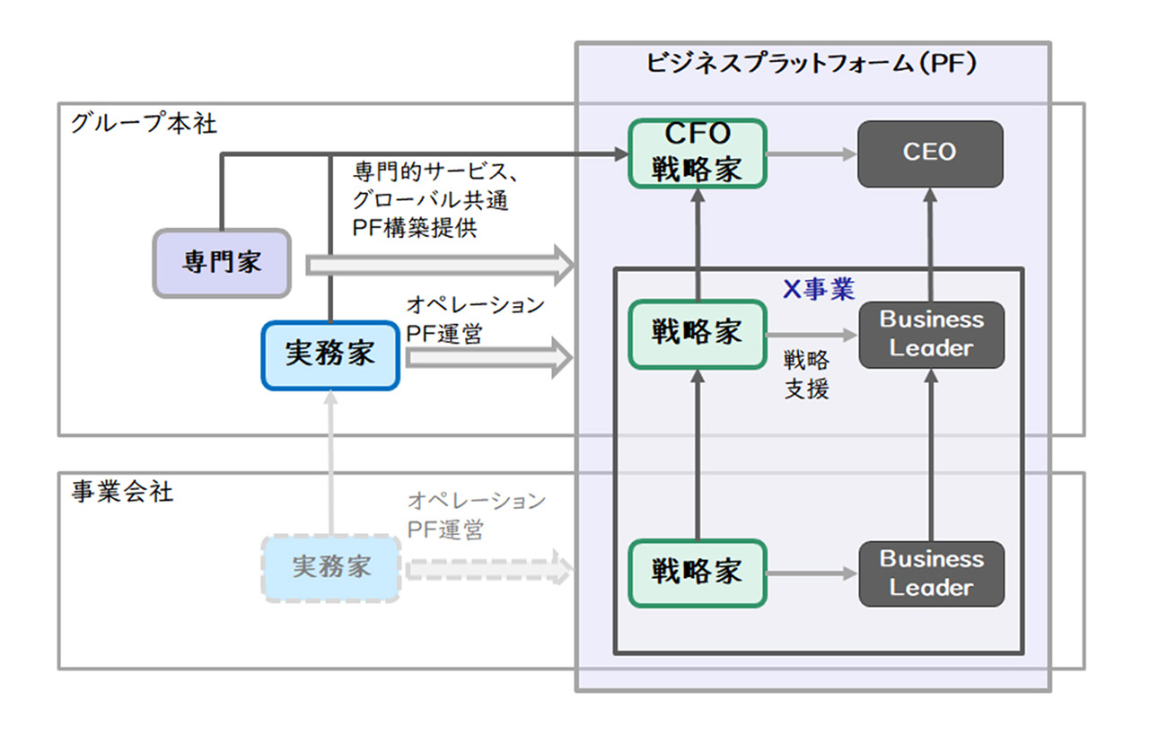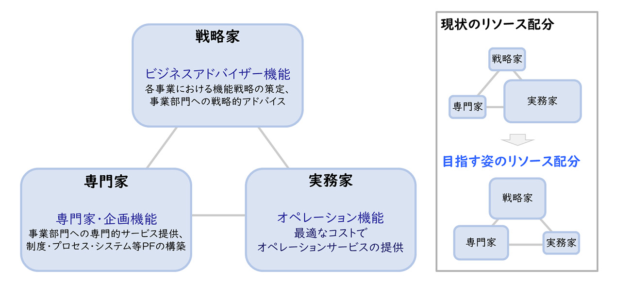 グループ経理財務部門の戦略家・専門家・実務家の配置方針を検討します。戦略家は事業ラインに合わせて配置し、専門家はグループ本社に配置し、実務家はシェアドサービスセンター(SSC)として地域統括会社等に配置し、そのうえで各々具体的役割・レポートライン・事業との関係等を定義していきます。