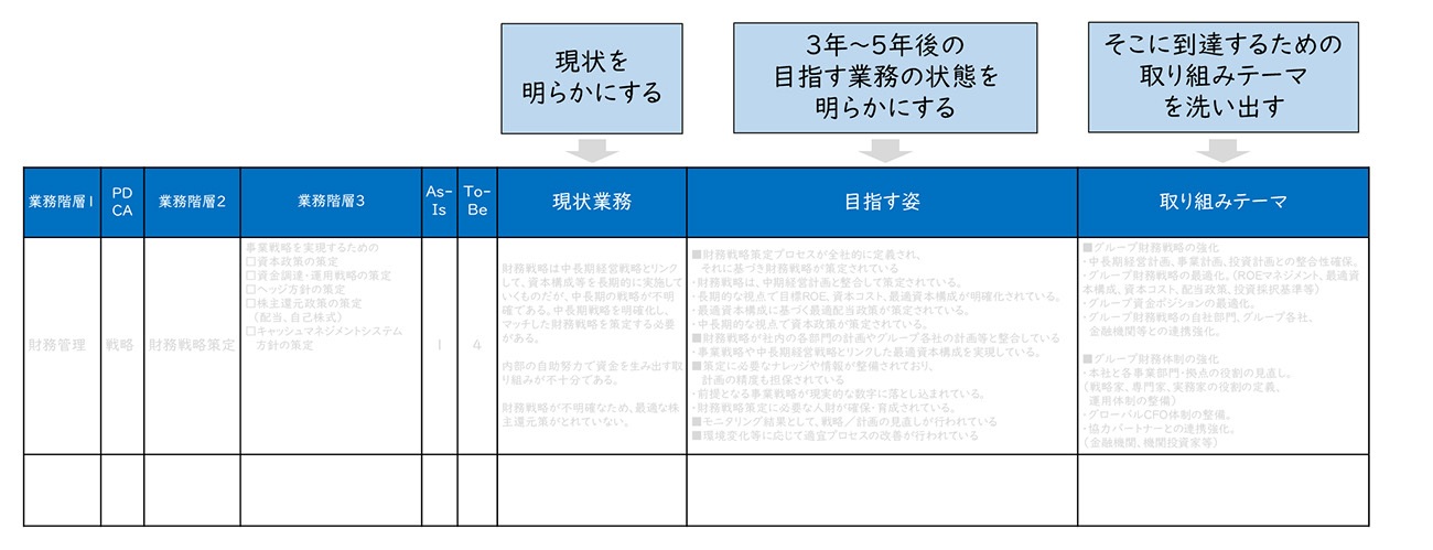 目指す姿実現のための取り組みテーマ検討では、特定の期限(3年~5年)において、各業務の目指すレベルを実現するための取り組みテーマや改革施策を明らかにしていきます。