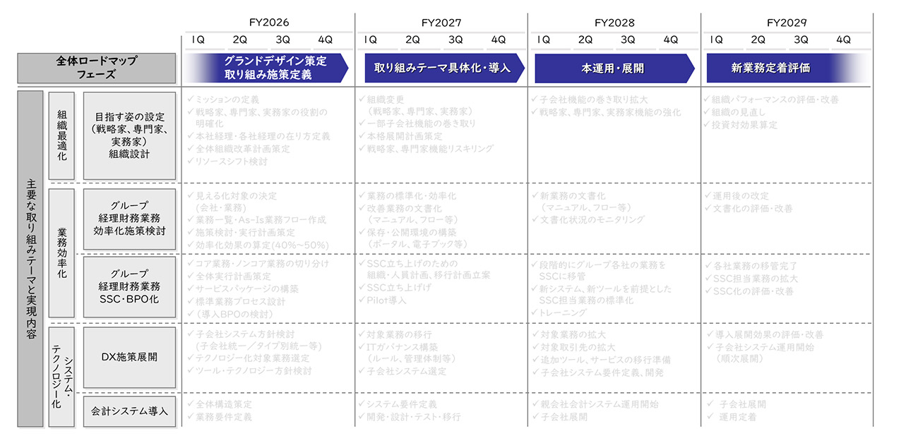 ロードマップ策定においては、各取り組みテーマの時間軸を考慮し、特定期間に人的リソースが集中しないように検討することが重要です。どうしても人的リソースが必要な場合、グループ経理部門全体での人財活用や外部リソースの活用なども検討してください。
