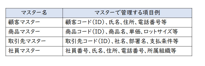 企業の基幹システムにおいてマスターは、取引や処理の基盤となるデータであり、下記のようなものがあります。マスターは、多くの業務で参照されるため、データの整合性が重要です。