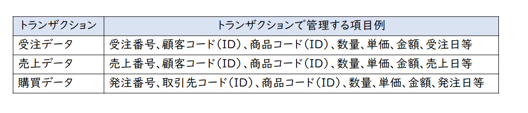 トランザクションデータは、日々の業務で発生する取引やイベントの記録データです。