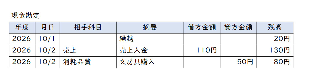 勘定科目(現金、売上、仕入、資産、負債など)ごとに取引の増減が記録され、残高が管理されます。