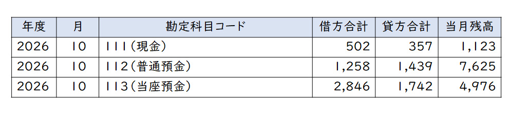 元帳残高テーブルは、一定の期間の総勘定元帳残高を、仕訳データを元に計算し記録していきます。