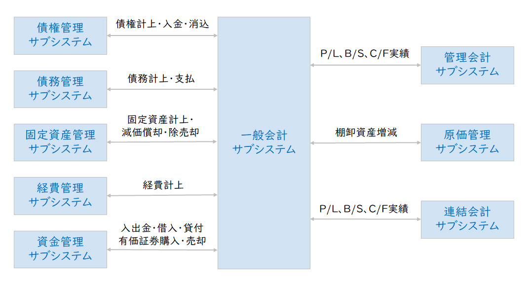 - サブシステム(補助簿):債権、債務、固定資産などの対象ごとに取引明細を履歴管理し、減価償却・金利計算などの処理も実施