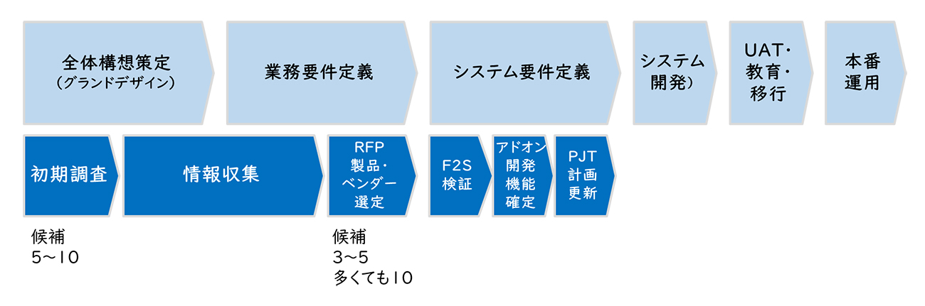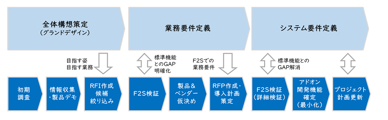 例えば、全体構想策定段階から製品候補を調査し、システム要件定義の前に標準機能とGAPになりそうな業務について、Fit to Standardで導入できるか否かを検証することが一つの方法として挙げられます。