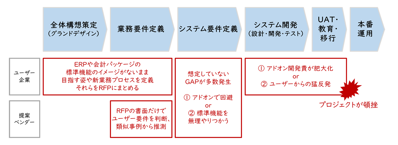 しかし、システム要件定義の段階でユーザー部門である経理財務部門も交えて、ERPや会計パッケージの持つ標準機能や標準プロセスを評価した結果、RFP作成段階やベンダー選定段階では想定していなかったギャップが多く発見され、最悪の場合にはプロジェクトが頓挫するケースもあります。