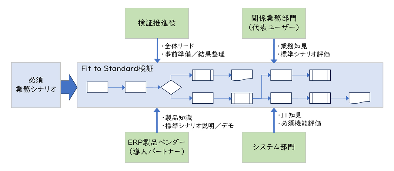 Fit to Standard検証では、検討企業側とベンダー側双方で、それなりの時間とメンバーが必要になります。機能とプロセスに関する詳細な説明を受けながら、想定する業務をERPや会計パッケージの標準機能で可能かどうかの議論をするため、一日二日ではできません。具体的には、システム要件定義で行う実機検証(POC、CRP)を前倒しして、限定的に行うイメージです。