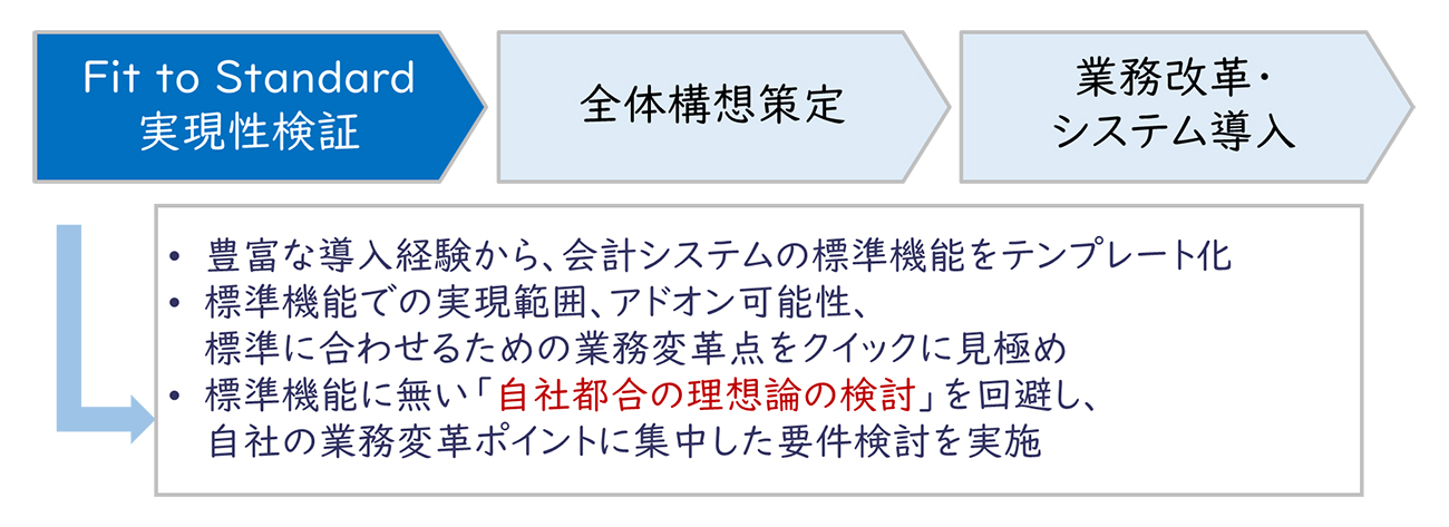 また、Fit to Standard実現性検証により、経理財務部門を中心としたユーザー部門がERPや会計パッケージの標準機能を事前に理解するため、全体構想策定フェーズにおいて「標準機能に無い自社都合の理想論の検討」にならず、自社の業務改革ポイントに集中した検討が可能になります。