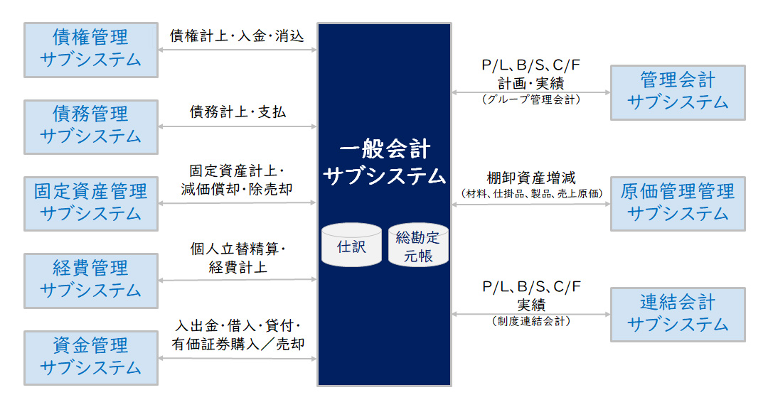 - 一般会計サブシステム:仕訳帳/総勘定元帳の中核機能