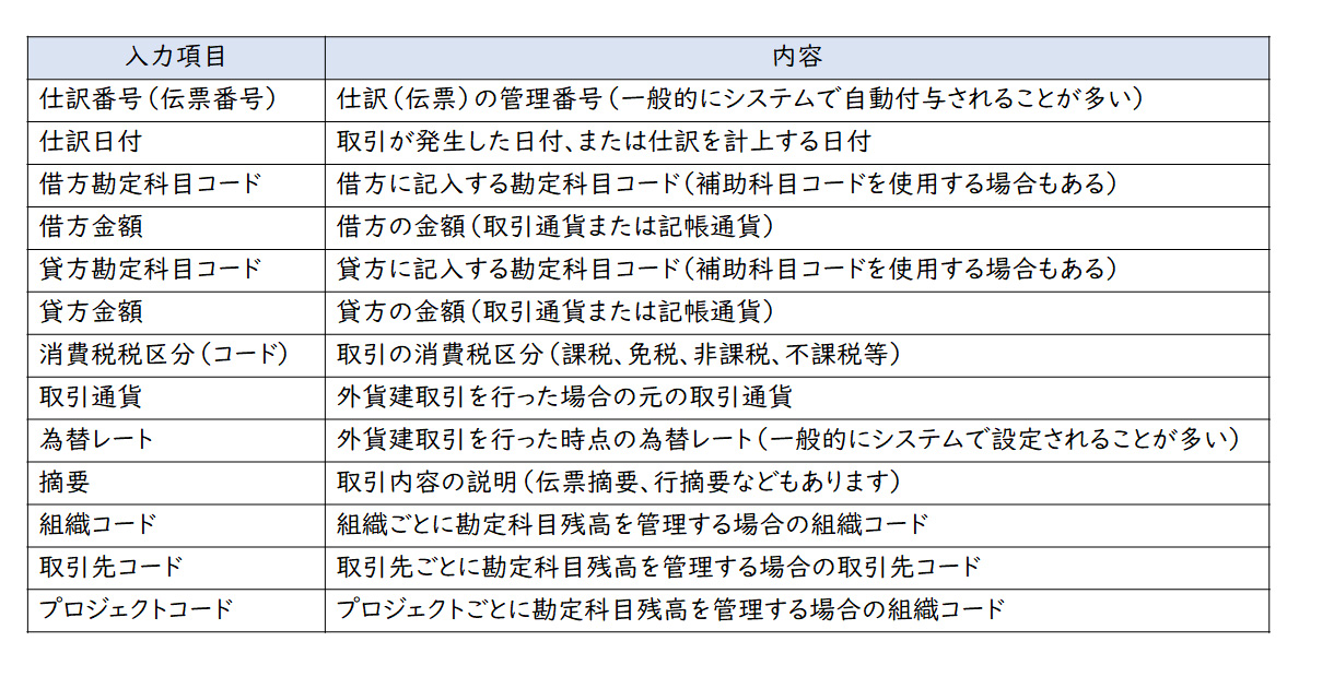入力項目は、ERPや会計パッケージによって異なるため、どのような項目が入力できるか、どの項目が必須項目か任意項目かなどの確認が必要です。特に、ユーザーが設定できるフリーの項目もあるので、それらがどれくらいあるかも確認が必要です。また、仕入取引、売上取引、入出金取引、資産取引等の取引種類(伝票のタイプ等)に応じて、入力項目が異なったり、入力項目に制限がかかったりする場合もあるので、導入時に確認が必要です。