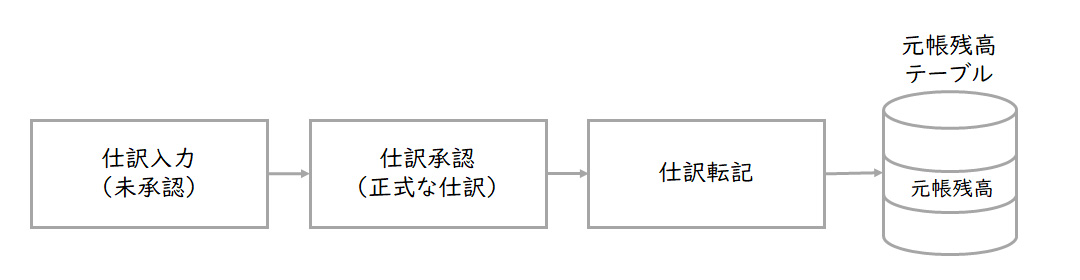 まず初めに、会計として記帳すべき取引が発生したら、会計システムに担当者が入力します。担当者が入力した仕訳を通常担当者の上長が承認します。この承認段階は複数ありますが、最終承認が終わった段階で正式な仕訳(直接修正・削除できません)となります。正式な仕訳に基づき、仕訳に関連した勘定科目の元帳残高が更新されます。