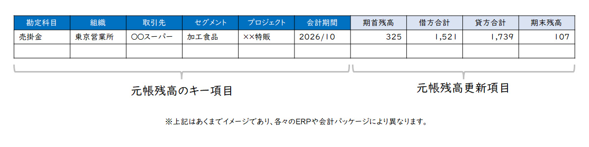 元帳残高テーブルの残高は、勘定科目や取引先、組織等のデータ項目に応じて細かい組み合わせで管理できます。この残高を持てる項目を「元帳残高(テーブル)のキー項目」ということもあります。