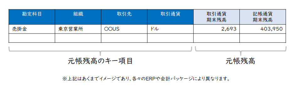 外貨建取引をした場合、外貨建で計算する必要がある資産・負債(主に金融商品)について、元帳残高を外貨建で保持できるものもあります。また、債権サブシステム、債務サブシステム、資金サブシステム等では、外貨建資産・負債について計上明細単位で増減を管理できるものもあります。