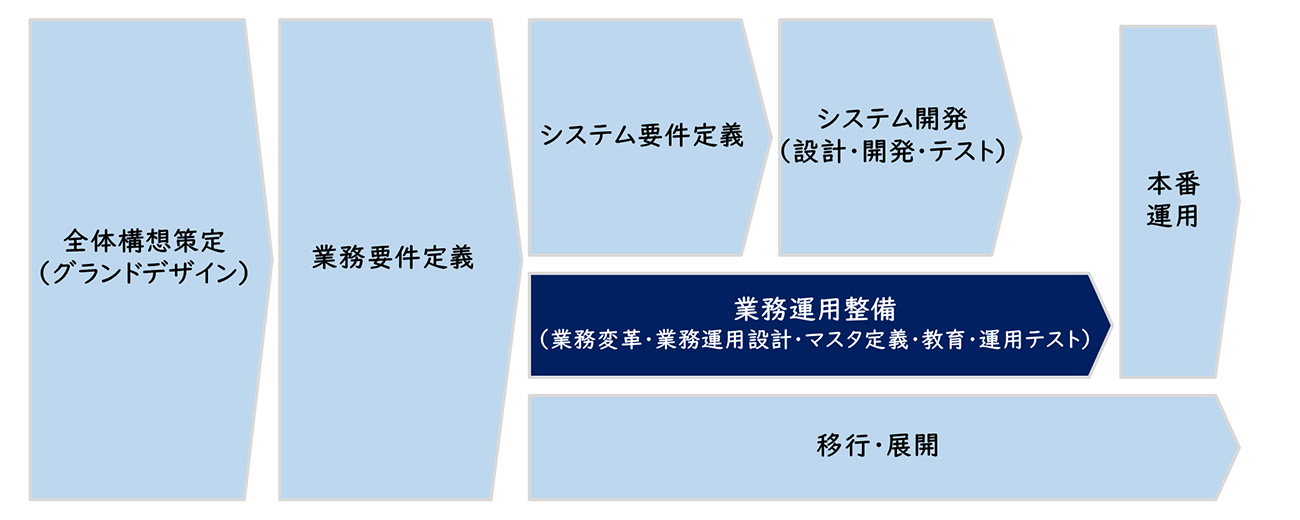 業務運用整備フェーズは、新システム稼働前ならびに新システム稼働後の安定した業務運用を支えるためのフェーズです。