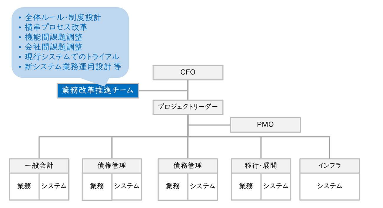 業務改革は経理財務部門だけでなく、経営層や他部門も巻き込んで行う必要があるため、業務改革を専門的に実施する推進体制が必要になってきます。レイヤーズ・コンサルティングでは、この業務改革をおこなっていく組織を独立した組織やチームとして組織化することを推奨しています。
