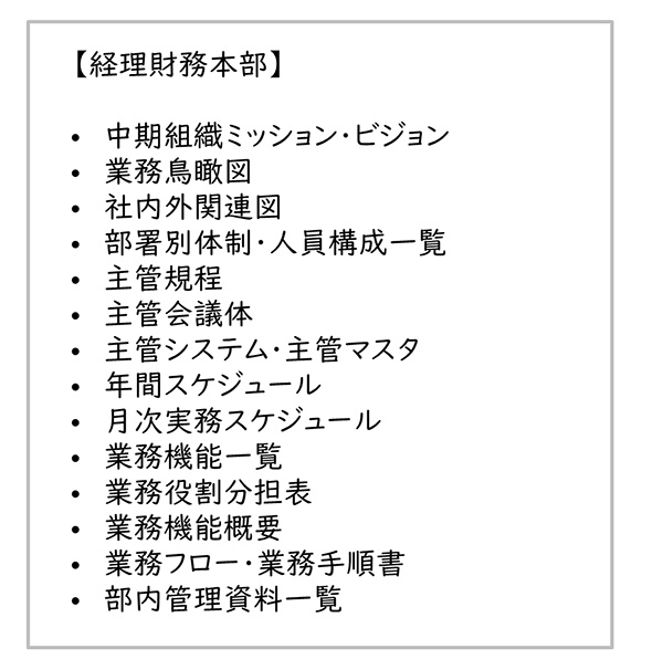 業務改革施策に合わせ、制度や業務ルールも変更していきます。例えば、前述のように業績管理制度や取引先との取引ルールなどを変更します。また、勘定科目体系等を変更する場合には、勘定科目規程なども変更します。