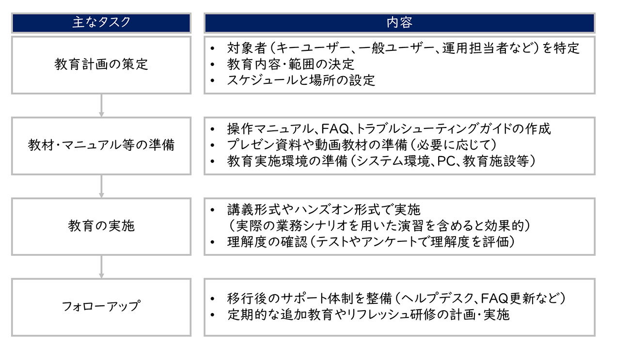 - 教育のポイント:ユーザーのスキルやサブシステム特性に応じた教育プログラム設計、余裕をもった実施タイミング、Q&A対応の専任窓口・ヘルプデスクなどユーザーサポート体制が鍵です。